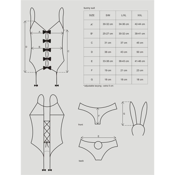 Este set incluye un corset con liguero, braguitas con una adorable cola blanca, medias sensuales y unas orejas de conejita, asegurando un look completo y fiel a la esencia del personaje. Confeccionado con tejidos elásticos y suaves, este conjunto se ajusta perfectamente a tu cuerpo, realzando tus curvas con elegancia y comodidad.